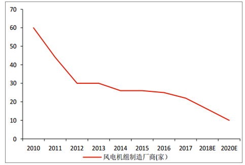 今年以來風電機組招標價格延續(xù) 2017年下跌趨勢, 2018一季度 2.0MW風電機組市場投標均價下降至 3300-3400 元/kW 左右,近一年累計降幅為 13.3%。 2.5MW 逐步成為市場主流機型,價格下降至 3484 元/kW,近一年累計降幅 15%。回溯上一輪價格戰(zhàn),發(fā)生在2010-2011 年以 1.5MW 機型為主戰(zhàn)場,國內(nèi)風電機組制造商從 60 家迅速下滑至 30 家。