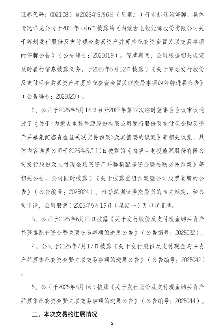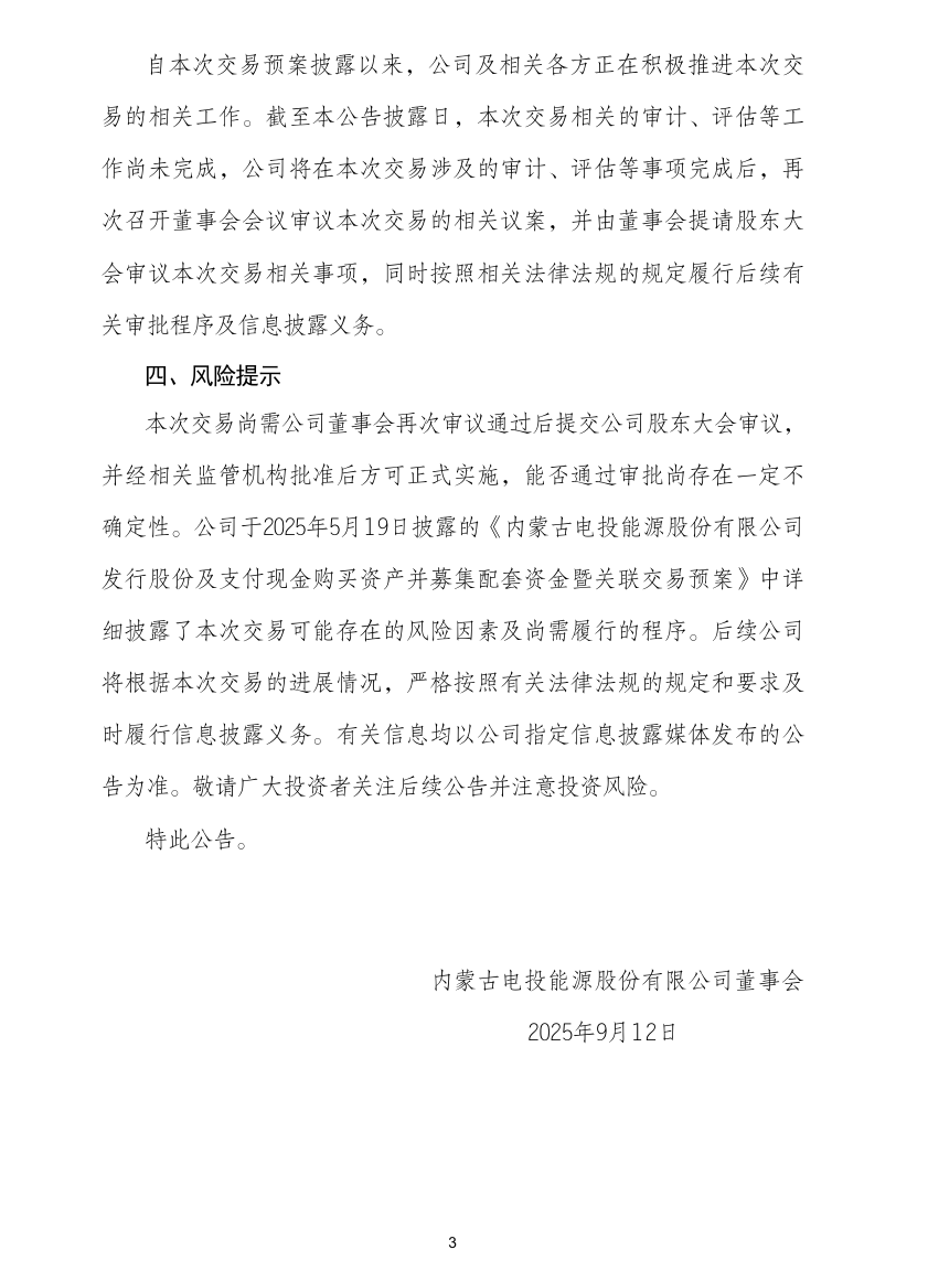 自本次交易預(yù)案披露以來(lái),電投能源及相關(guān)各方正在積極推進(jìn)本次交易的相關(guān)工作。截至本公告披露日,本次交易相關(guān)的審計(jì)、評(píng)估等工作尚未完成,電投能源將在本次交易涉及的審計(jì)、評(píng)估等事項(xiàng)完成后,再次召開董事會(huì)會(huì)議審議本次交易的相關(guān)議案,并由董事會(huì)提請(qǐng)股東大會(huì)審議本次交易相關(guān)事項(xiàng),同時(shí)按照相關(guān)法律法規(guī)的規(guī)定履行后續(xù)有關(guān)審批程序及信息披露義務(wù)。