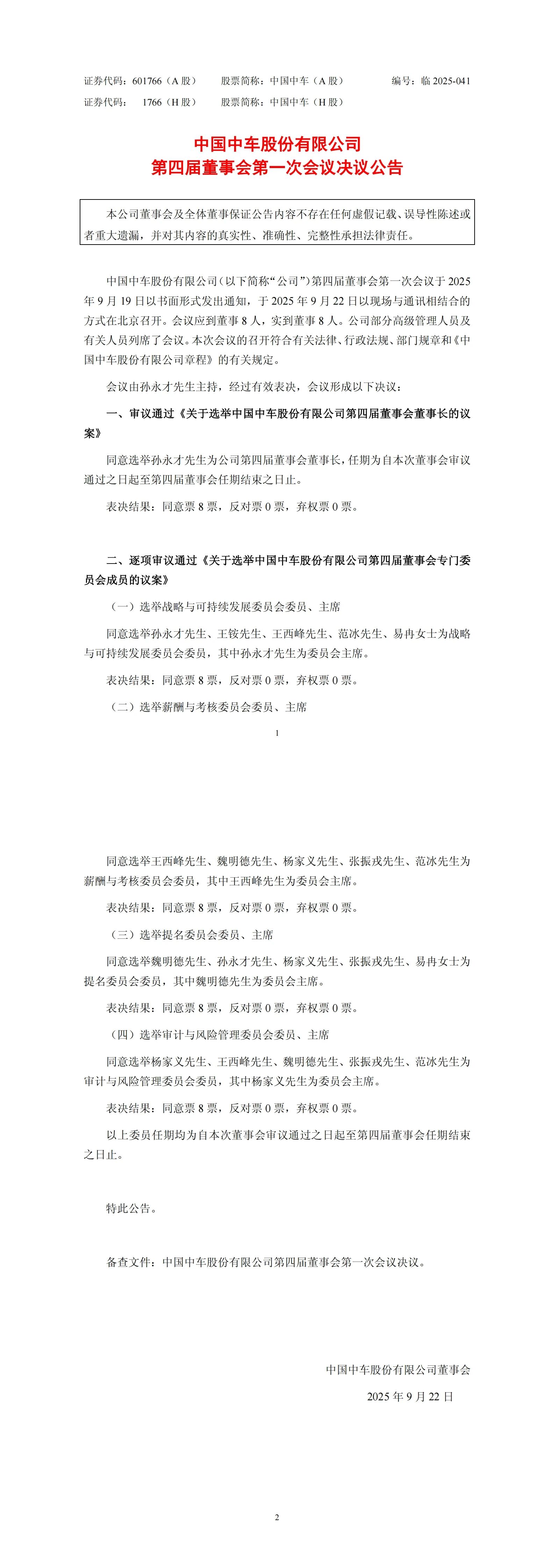 9月22日,中國中車股份有限公司第四屆董事會第一次會議在北京召開,審議通過董事長選舉議案,同意孫永才當選公司第四屆董事會董事長,任期自本次會議審議通過之日起至第四屆董事會任期結(jié)束。
