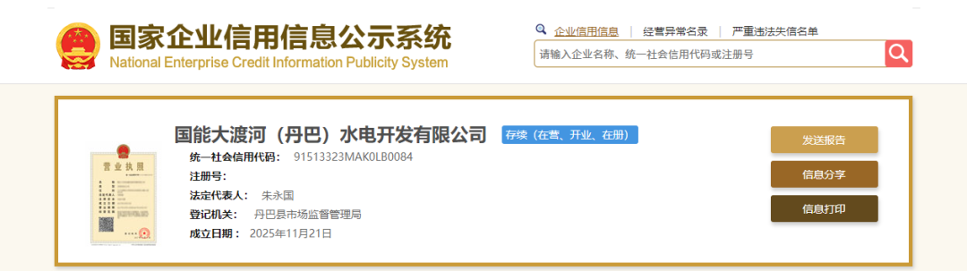 國家企業(yè)信用信息公示系統(tǒng)顯示,11月21日,國能大渡河(丹巴)水電開發(fā)有限公司成立,注冊資本36億元,法定代表人朱永國。