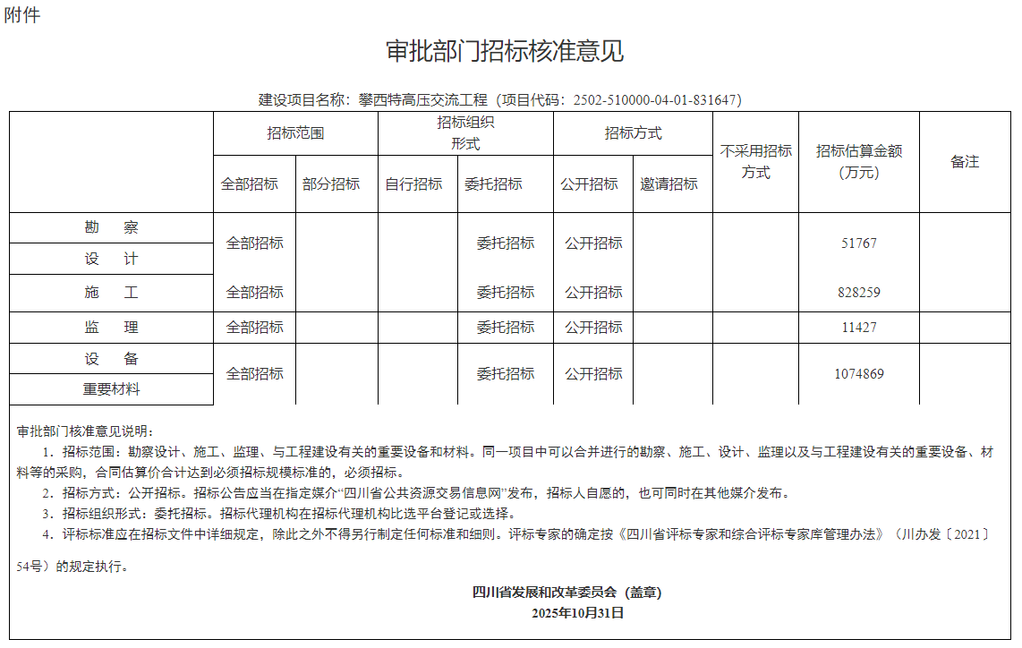 報來《關(guān)于呈批核準(zhǔn)攀西特高壓交流工程的請示》(川電發(fā)展〔2025〕181號)收悉。經(jīng)研究,現(xiàn)將攀西特高壓交流工程(項目代碼:2502-510000-04-01-486846)核準(zhǔn)事項批復(fù)如下: