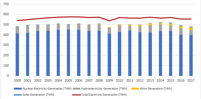 圖1.法國2000 - 2017年的發(fā)電量(按太瓦時計算)。