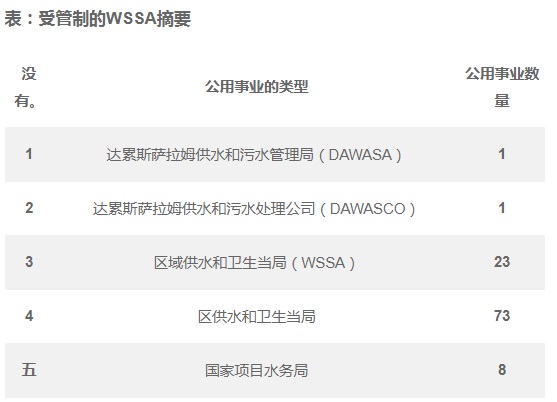 目前,EWURA管理130個供水和衛(wèi)生當(dāng)局,為區(qū)域和地區(qū)總部,小城鎮(zhèn)和國家項(xiàng)目水務(wù)局提供供水和衛(wèi)生服務(wù),如負(fù)責(zé)水資源部長宣布的受管制WSSA列表所示, 并總結(jié)如下。